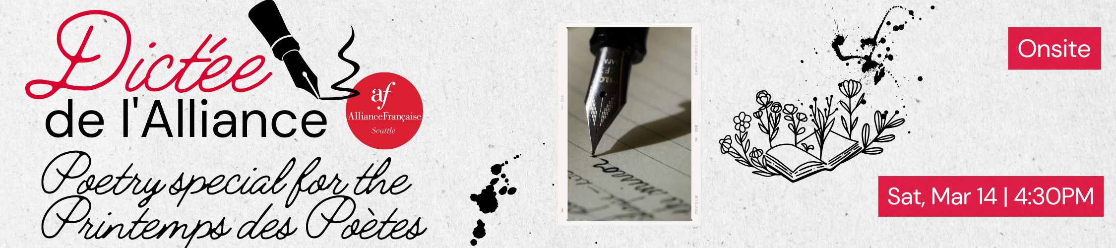 Hello Francophones and French learners! Join us for your favorite French exercise, la dictée, in this event hosted at the Alliance Française de Seattle. This special session will celebrate the Printemps des Poètes with a beautiful piece of French poetry.