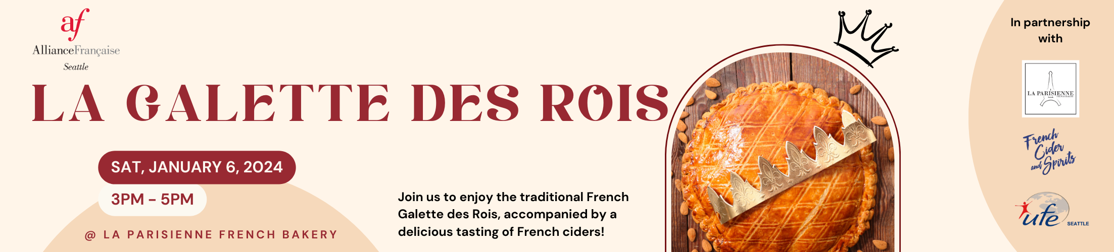 Join the Alliance Française de Seattle, La Parisienne French Bakery, French Ciders & Spirits, and the Union des Français à l’Etranger (UFE Seattle) to celebrate the Epiphany and its traditional Galette des rois.